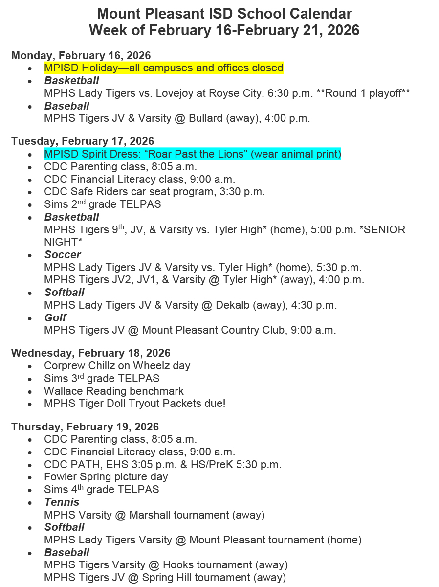 All MPISD campuses and offices will be closed Friday, February 13 and Monday, February 16! Enjoy your long weekend Tigers!