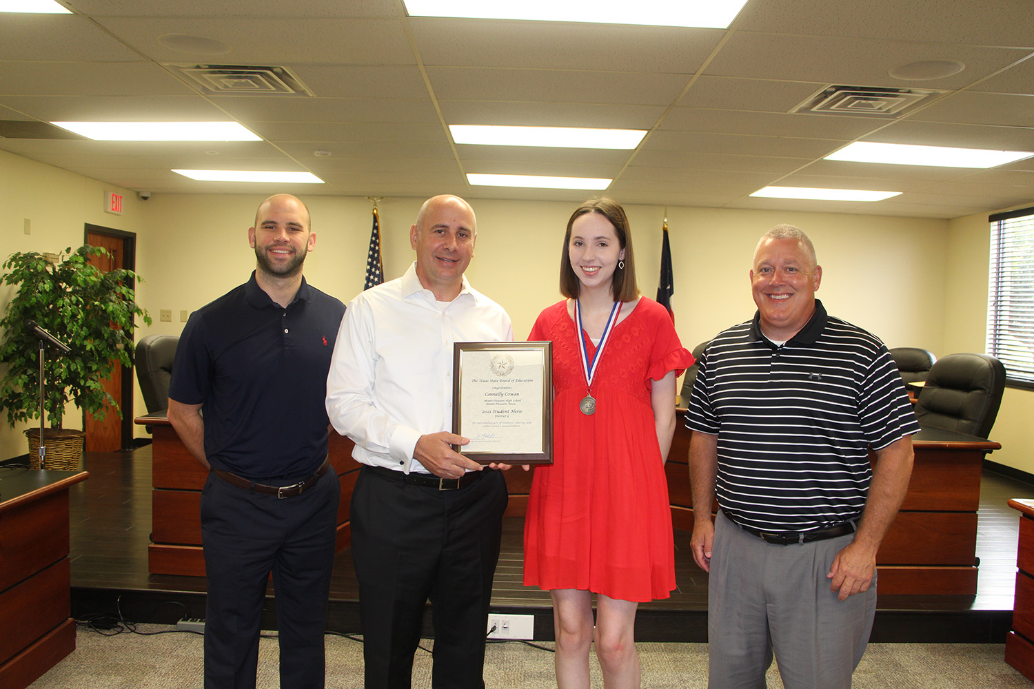 MPHS Principal Craig Bailey, SBOE Chair Dr. Keven Ellis, Connelly Cowan, MPISD Superintendent Judd Marshall