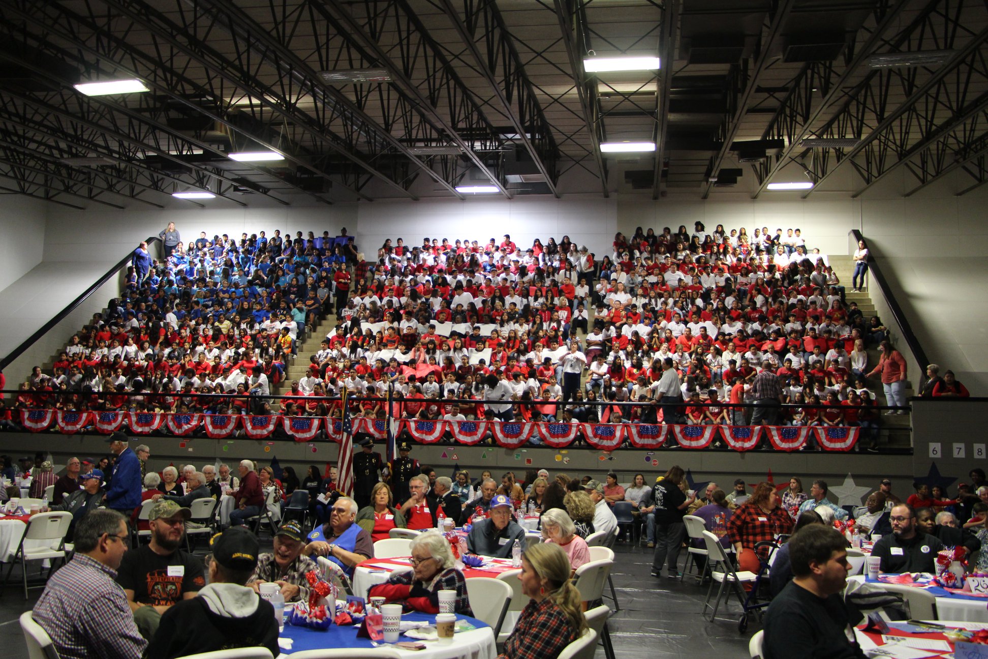 Military Veterans and their families filled tables on the floor of the P.E. Wallace Middle School Gym while students and staff filled the stands in colored shirts that represented the flag of the United States on Monday, November 11 as Wallace presented their 22nd annual Veterans Day Program. Wallace and MPHS students served the veterans and their families lunch while they were entertained by music from the past played by Tim Ervin on the trumpet. Local businesses donated gift cards that were presented to the audience members as door prizes. Mr. Bo Rester unveiled the sign that will designate a section of Highway 271 as the Titus County World War II Veterans Memorial Highway.