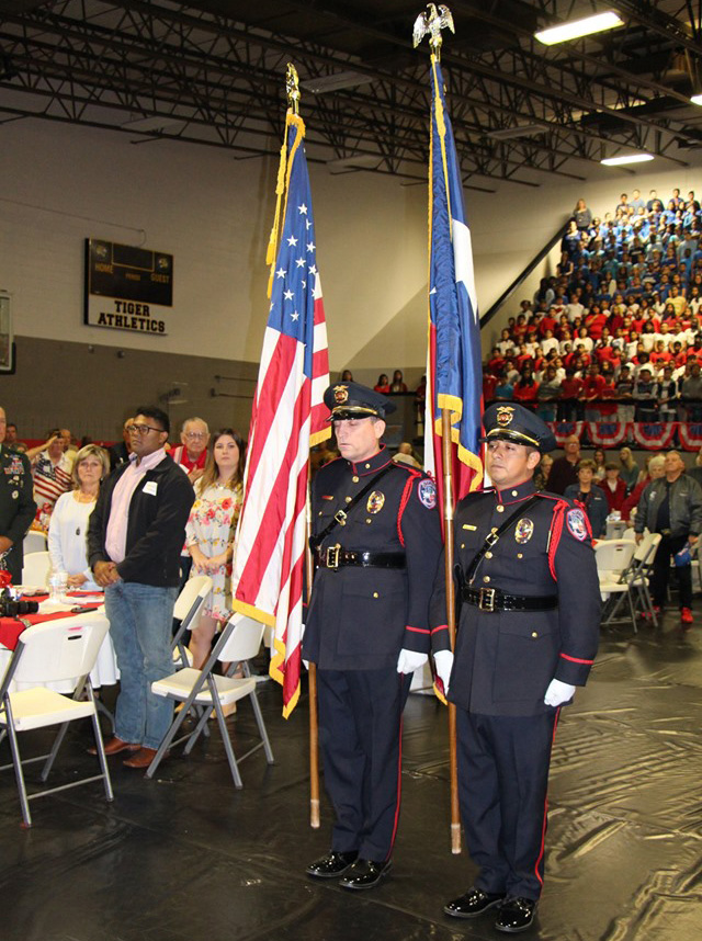 The Mt. Pleasant Police Department posted and retrieved the American and Texas flags, while Wallace students presented the military branch flags and, finally, the POW-MIA flag which was accompanied by a moment of silence.