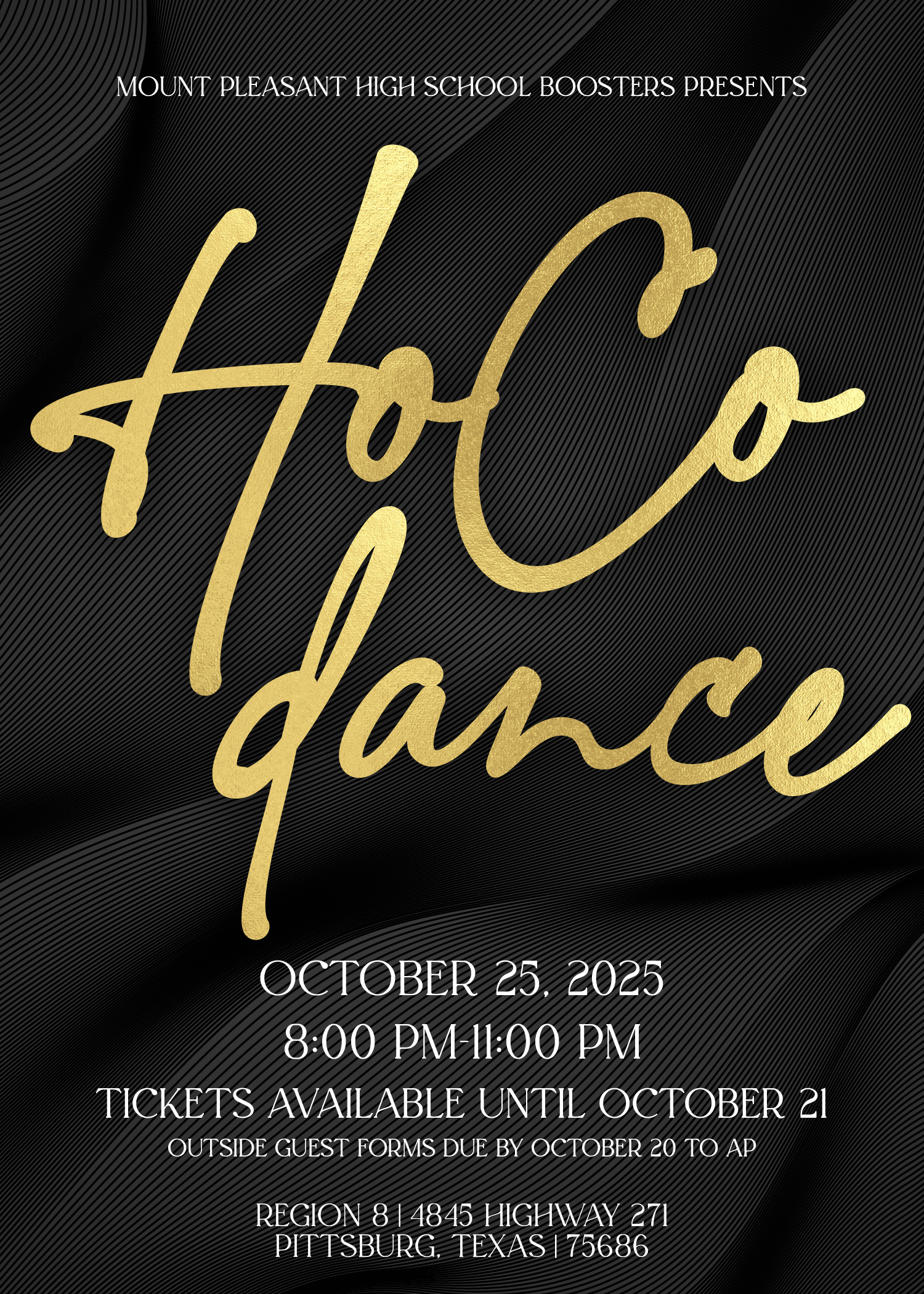 View Larger Image Homecoming Dance Tickets Now on Sale! MPHS Homecoming Dance Saturday, October 25 8:00-11:00 p.m. Region 8 ESC 4845 Highway 271 If you want to bring a guest who does not attend MPHS, you must get an approval form from the AP office. GET TICKETS HERE! Courtney Marshall2025-10-08T23:10:55-05:00 Share This Story, Choose Your Platform! FacebookTwitterLinkedInRedditTumblrPinterestVkEmail Leave A Comment Cancel replyComment Save my name, email, and website in this browser for the next time I comment.