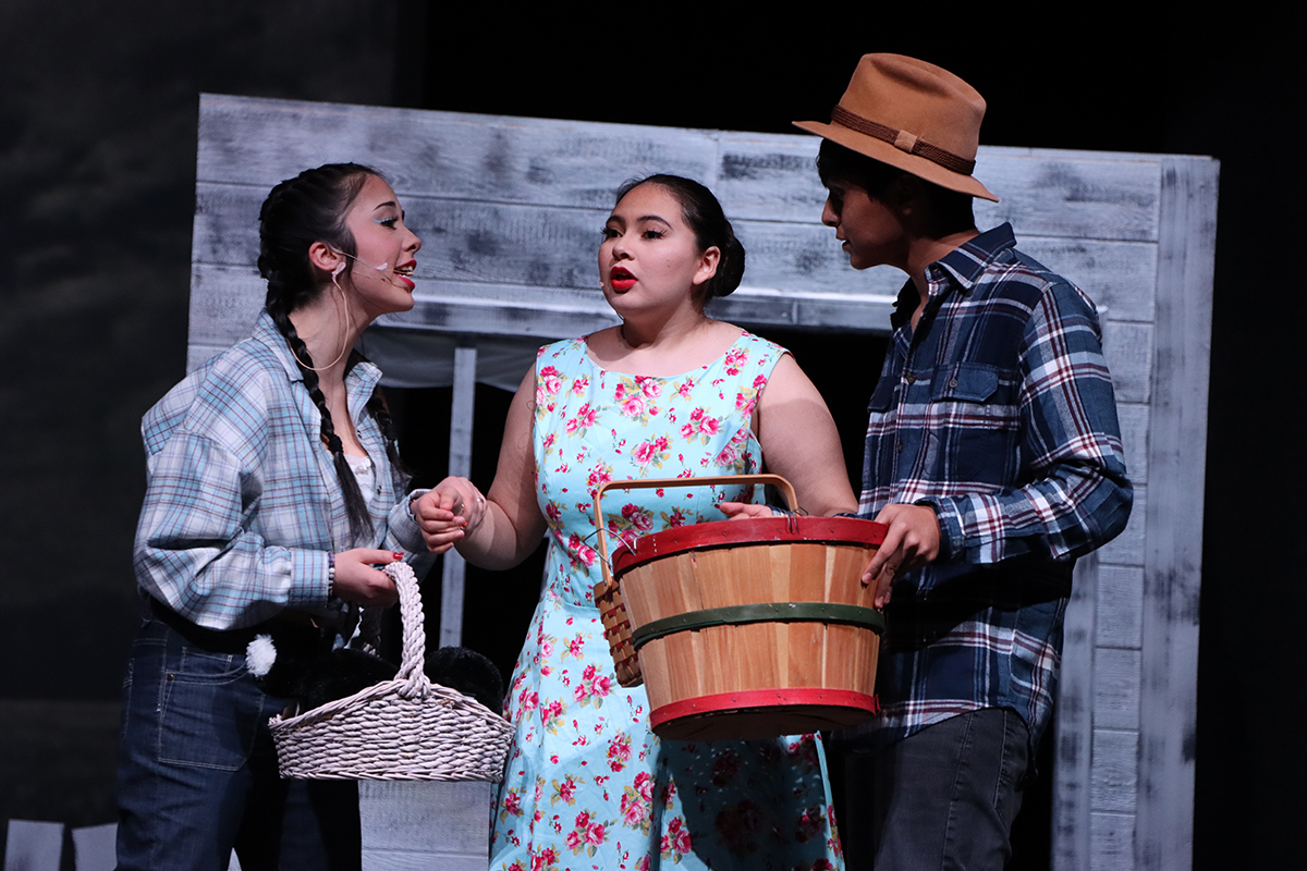 1: Dorothy (Madison Zepeda, left) tells Aunt Em (Summer Murrillo, center) and Uncle Henry (Jose Jimenez, right) about meeting Miss Gulch on her walk home