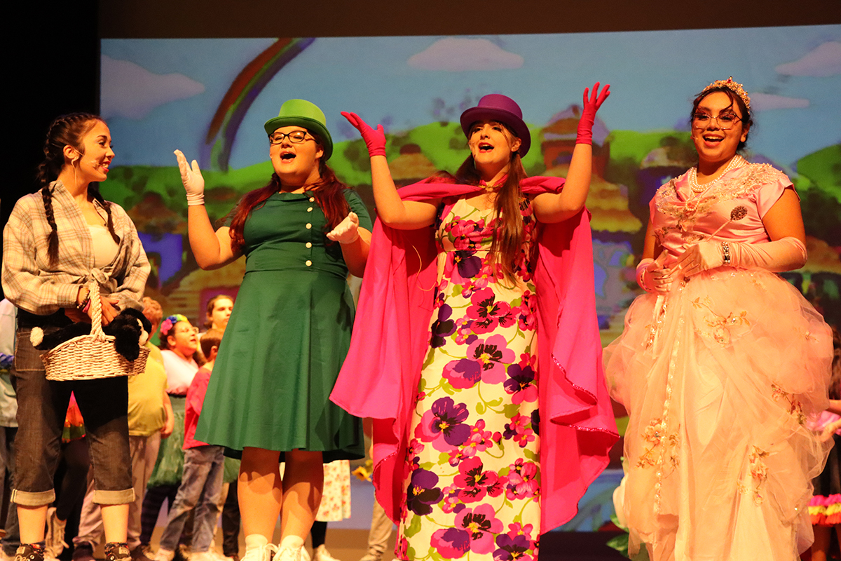 4: Dorothy (Madison Zepeda, left) is welcomed to Munchkin Land by (L to R) Ensemble member (Danika Beckham), Leader of the Winkie Guards (Emma Sanders) and Glinda the Good Witch (Gracie Martinez)