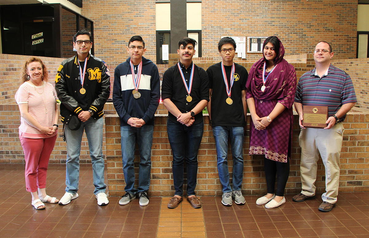 Photo: UIL Director and Coach Regina Crouch, Enrique Martinez, Jose Liera, David Barboza, Pornphiphat Saiboonchan, Sanum Shahid and Calculator Applications Coach Andy Speir.
