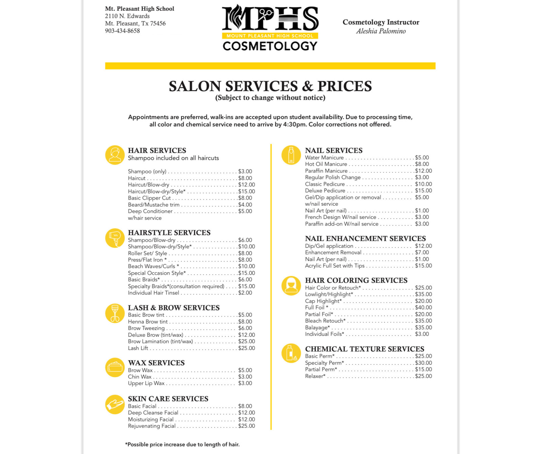 Cosmetology Salon Services & Prices