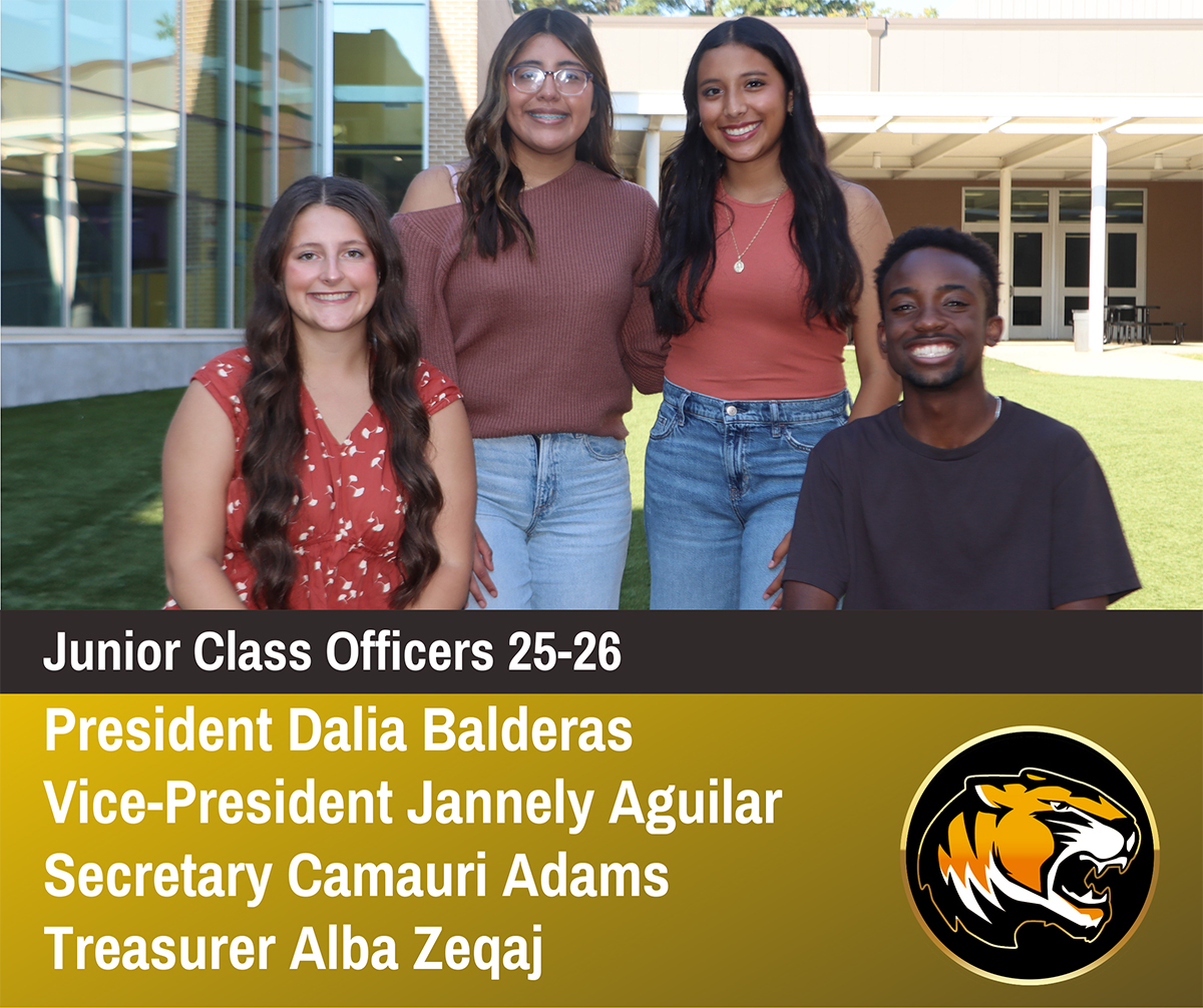 Leading the Junior class are President Dalia Balderas, Vice President Jannely Aguilar, Secretary Camauri Adams, and Treasurer Alba Zeqaj.