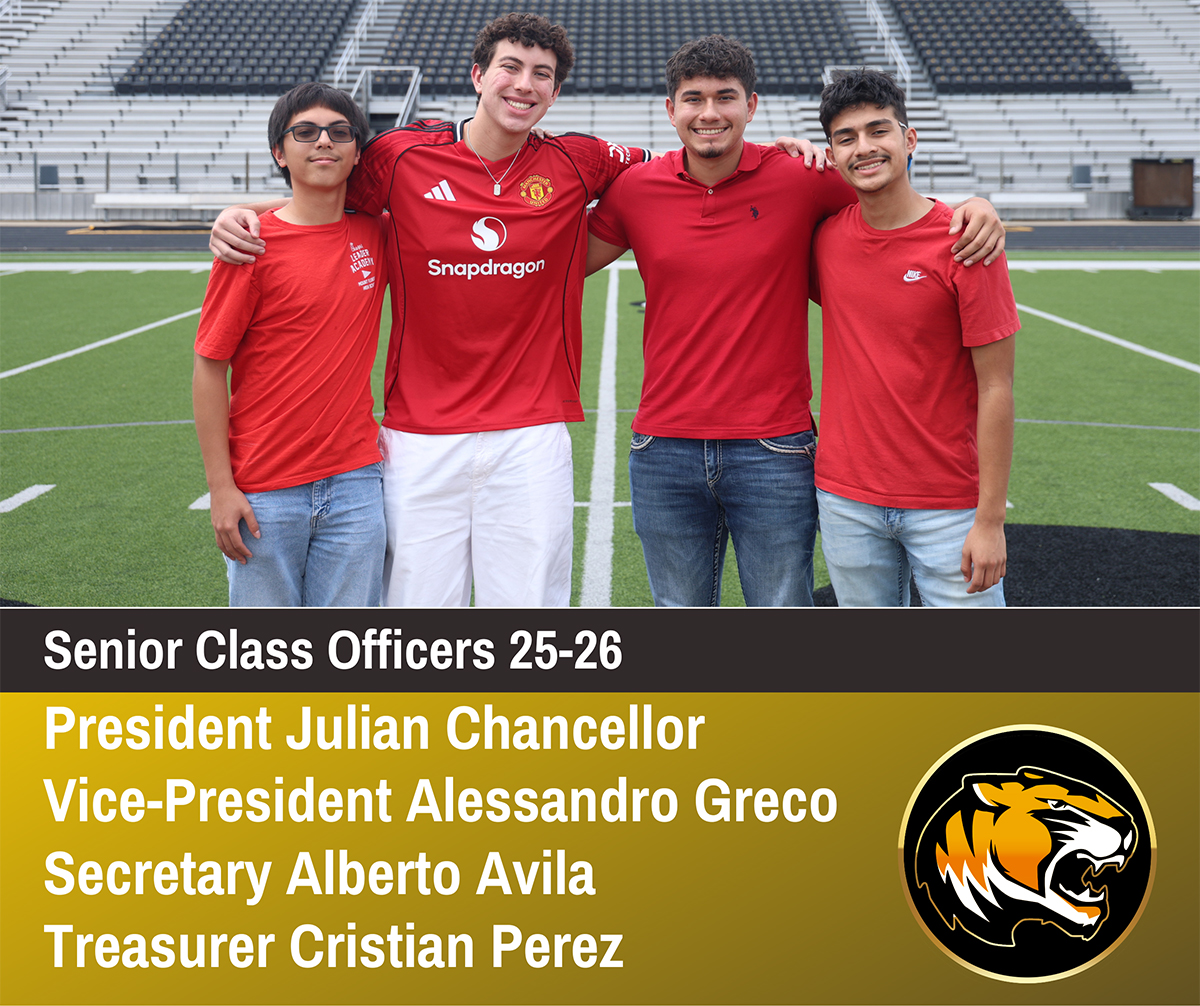 The Senior class officers are President Julian Chancellor, Vice President Alessandro Greco, Secretary Alberto Avila, and Treasurer Cristian Perez.