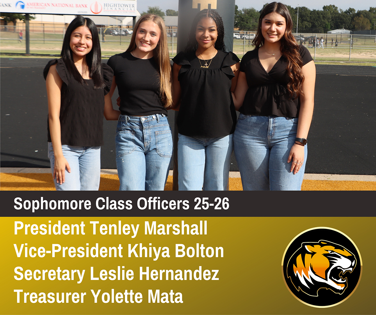 Officers for the Sophomore class are President Tenley Marshall, Vice President Khiya Bolton, Secretary Leslie Hernandez, and Treasurer Yolette Mata.