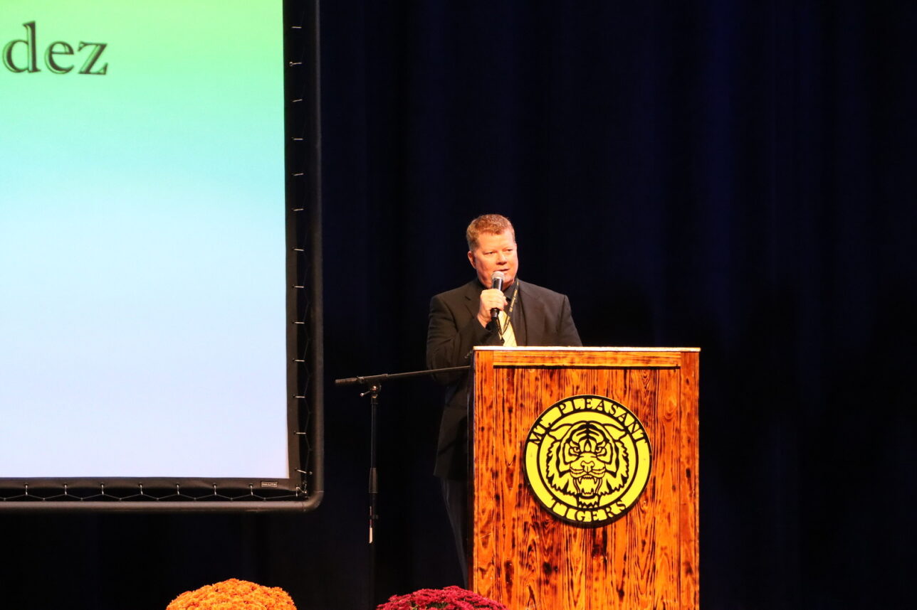 2: Mike Lide, MPISD Deputy Superintendent, encourages the NHS members to read and study history