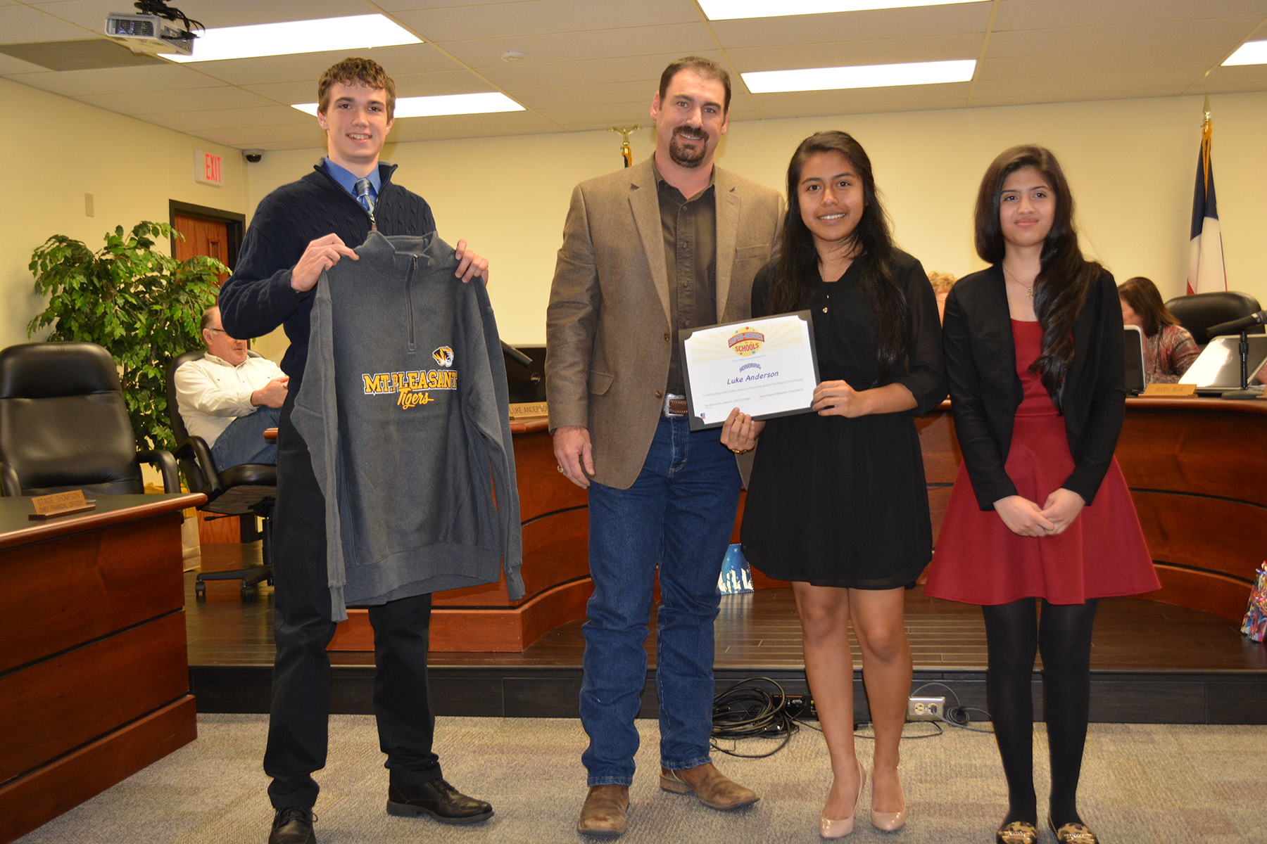 January is School Board Recognition Month in Texas. During the January 19th School Board meeting MPISD Board members were presented with gifts from District campuses and certificates thanking them for their service to the District’s students and staff. Students from our campuses were enlisted to help hand out the certificates. Presenting the certificate to Luke Anderson are National Honor Society officers from MPHS: President Joshua Yox, Vice president Nayeli Fuentes and Secretary Leivy Zuniga.