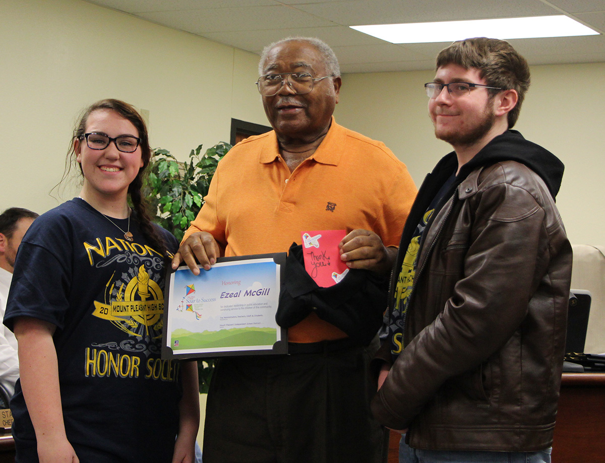January is School Board Recognition Month in Texas. During the January 22nd School Board meeting, MPISD Board members were presented with gifts from District campuses and certificates thanking them for their service to the District’s students and staff. Students from our campuses were enlisted to help hand out the certificates. Presenting the certificate to Board Secretary Ezeal McGill are National Honor Society members Austin Cheatham and Abby Sneed.
