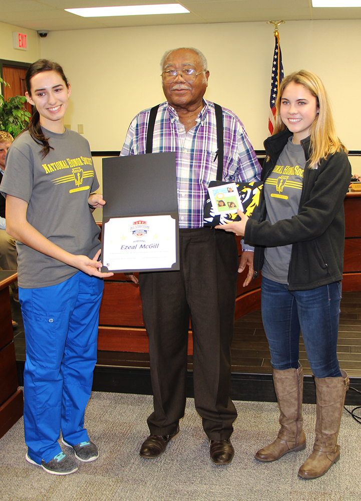 January is School Board Recognition Month in Texas. During the January 17th School Board meeting MPISD Board members were presented with gifts from District campuses and certificates thanking them for their service to the District’s students and staff. Students from our campuses were enlisted to help hand out the certificates. Presenting the certificate to Board Secretary Ezeal McGill are National Honor Society President Emily Brown and Secretary Morgan Thurman.